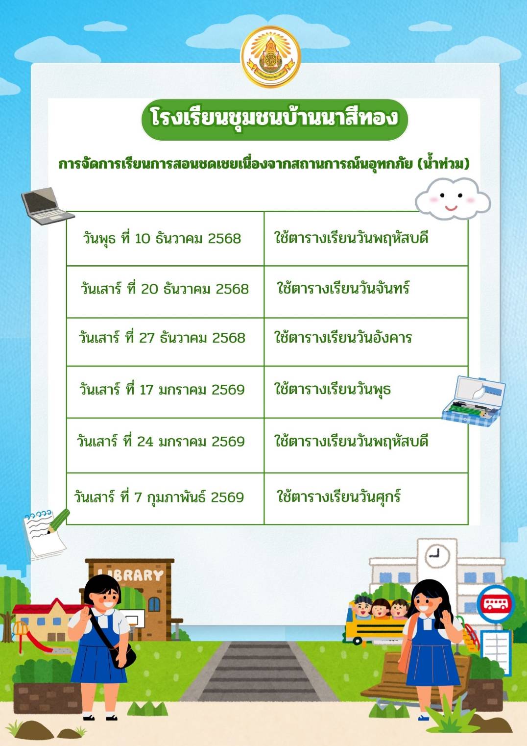 ตารางการเรียนชดเชยเนื่องจากการปิดเรียนในสถานการณ์น้ำท่วม
